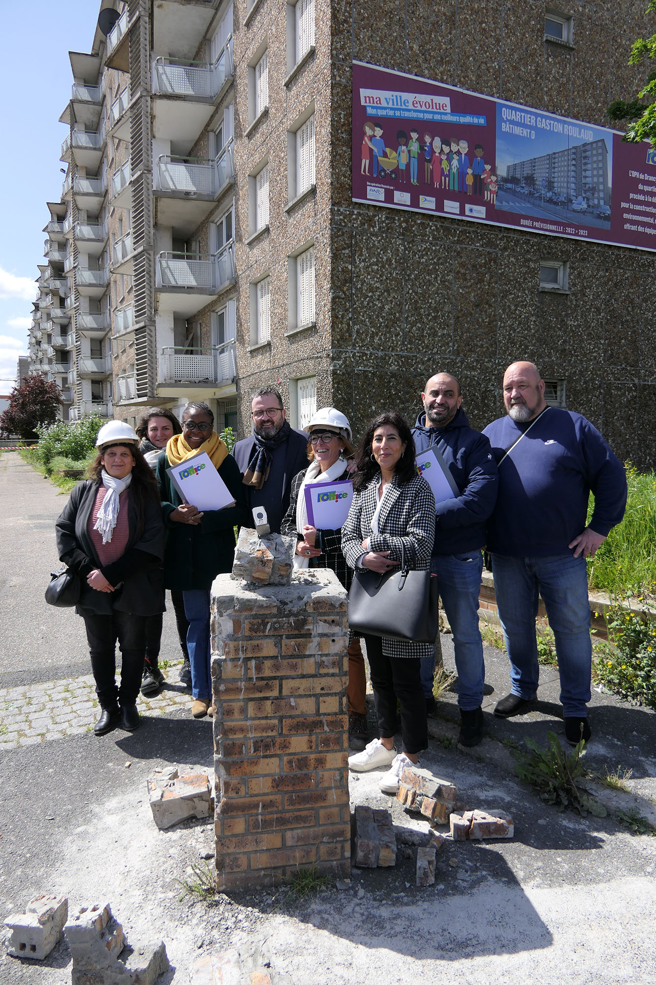 Le 16 mai 2023, la municipalité et l’OPH ont souhaité marquer le démarrage de la démolition du bâtiment D avec un « coup de pioche symbolique ».